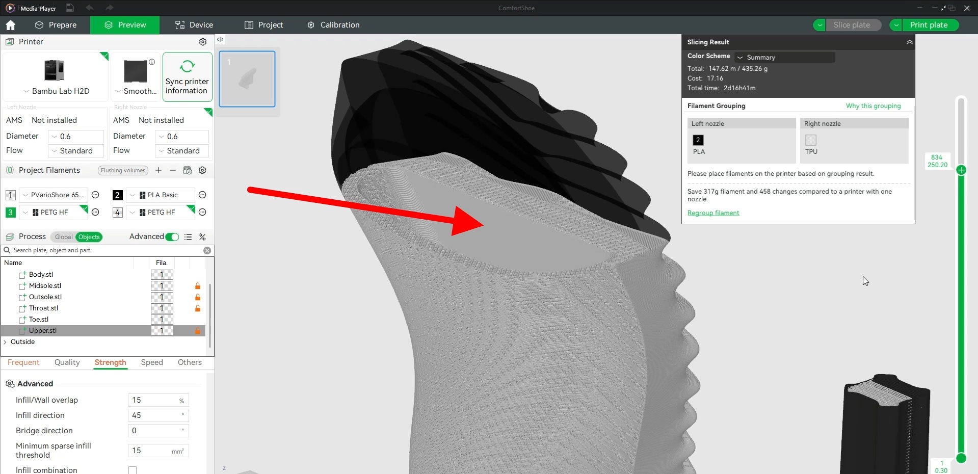 I’ve intended for this 3D printed shoe design to be printed nearly vertically with the heal down and supported at the collar and back of the heel. You could still print in the 45 degree orientation I’ve shown in other posts if you don’t have an H2D or equivalent with sufficient build height and dual nozzles. Note that I did try the approach of giving the shoes a flat back and printing on that to reduce the need for support material and allow printing on a single nozzle printer. But the collar didn’t turn out very well when not supported. You’ll see this shoe on my right foot in the videos. It’s fairly mucked up by this point from modifications I tried to make to it after printing.